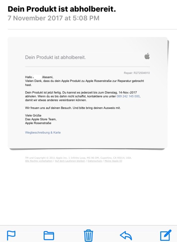 マックブック直りました。取りに行きました。