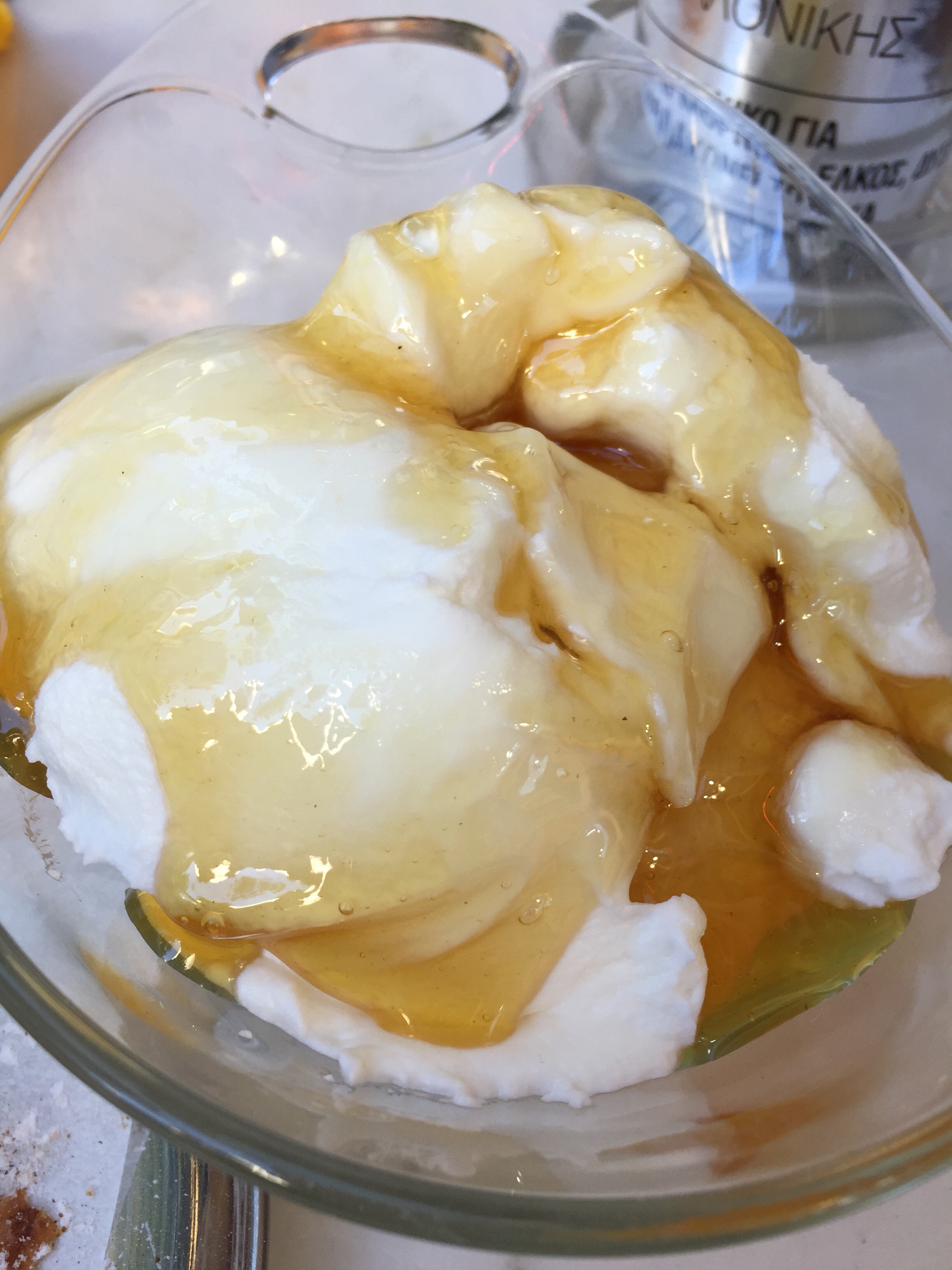 ブタガスと蜂蜜の乗ったグリークヨーグルトとグリークコーヒーを頼みました。