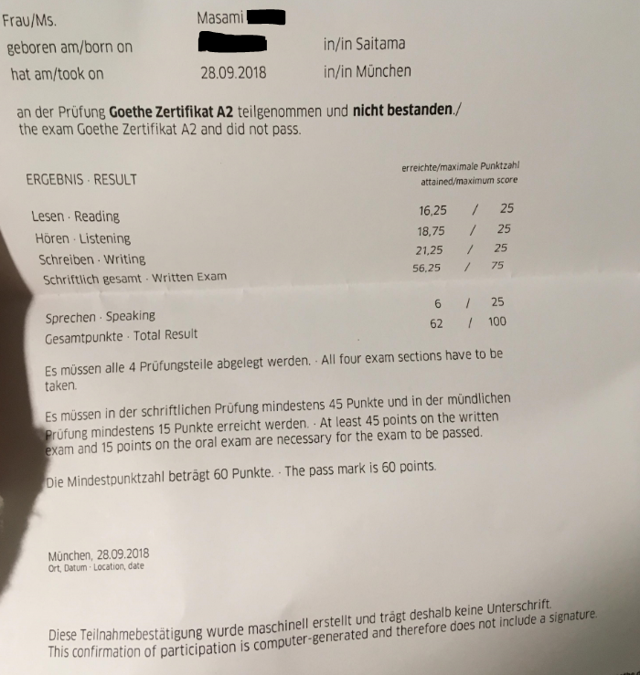 結果から言いますと、筆記は合格しましたが、スピーキングは不合格でした。なので、A2は不合格です。