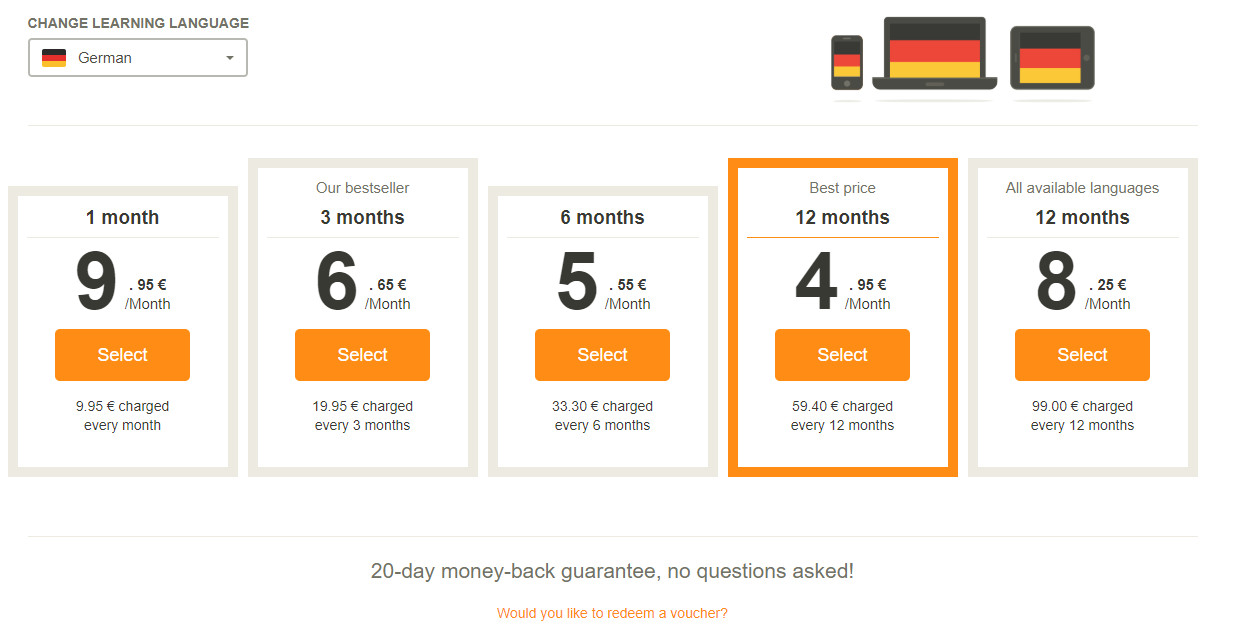 こちらからアクセスすると1週間無料になりますのでぜひ。料金のリストは、ドイツ語の場合こんな感じで、私はなんとなく12か月のにしてみました。